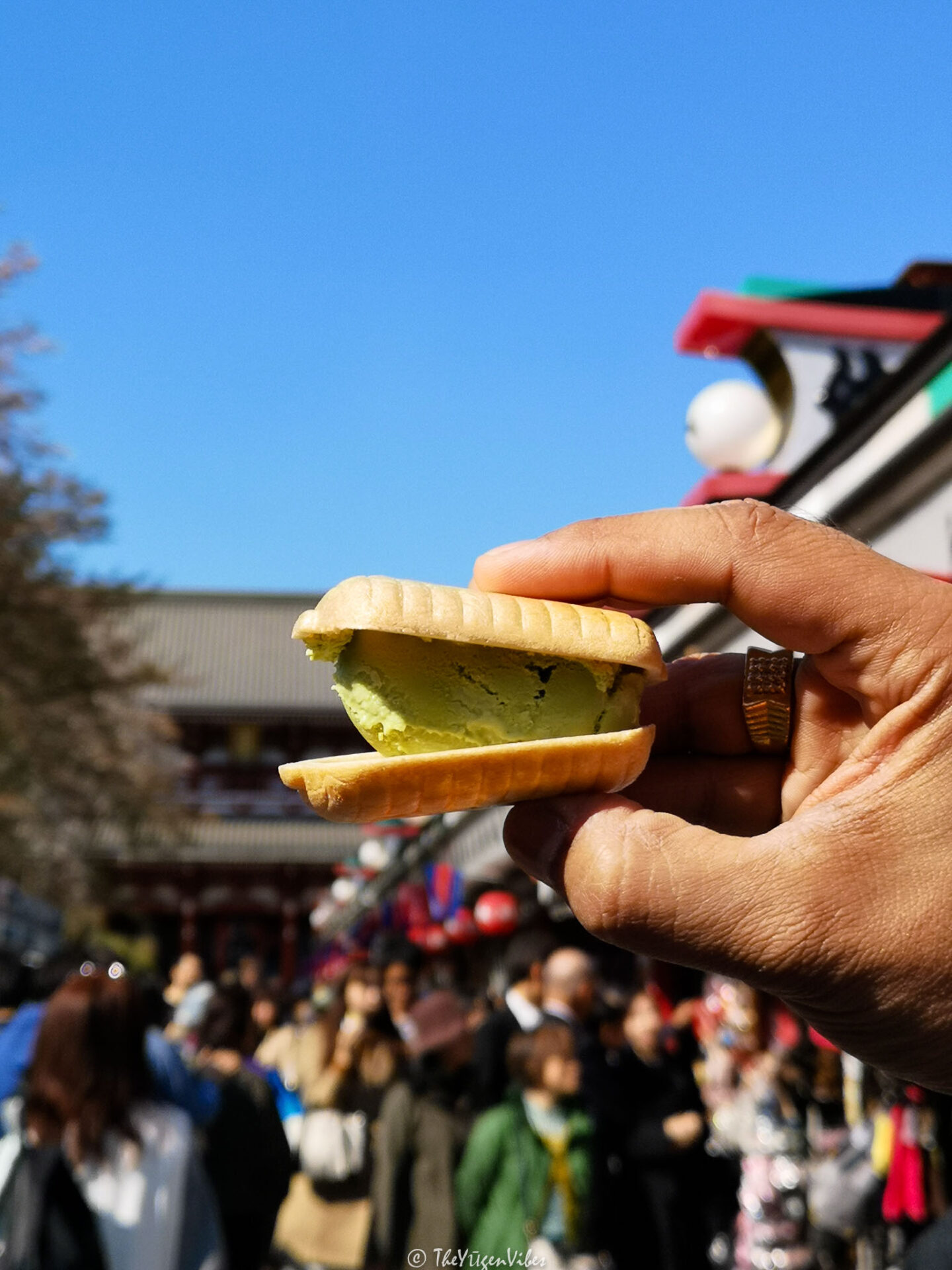 The historical street of Nakamise leads from the outer gate of the temple to the inner gate. This shopping street is lined with numerous shops selling antiques, souvenirs and popular local snacks. We tasted the famous Ningyo-Yaki and Ice cream Monaka (Ice cream sandwich) at Cyouchin-Monaka. If you happen to be a foodie, we would highly recommend taking a food tour in Asakusa. Other popular sweets to try at Nakamise would be Daifuku, Dango and Taiyaki. These regular sweets are usually vegetarian and are made with rice flour and bean paste. We would still recommend checking with the seller for any dietary requirements.